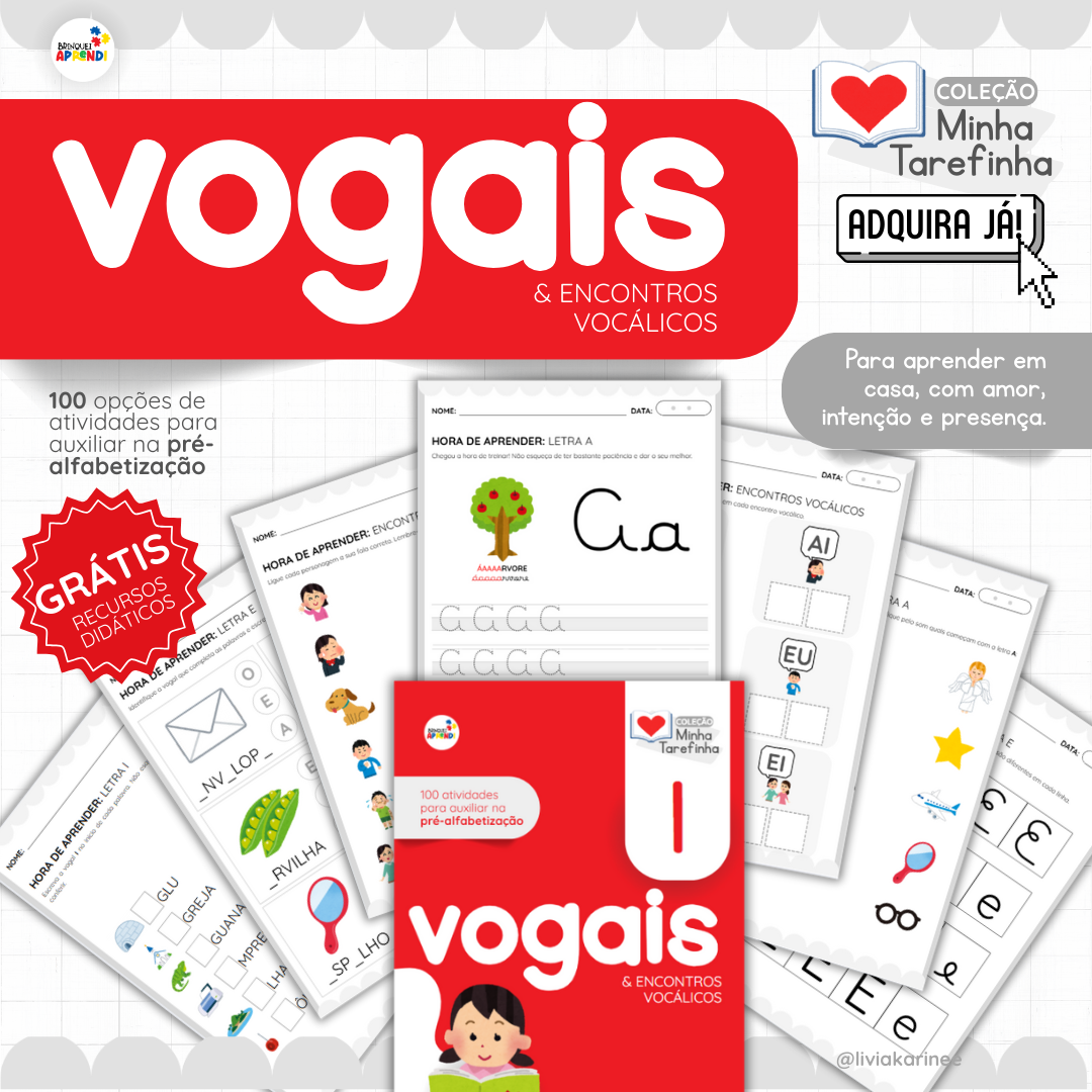 Material pedagógico desenvolvido para apoiar o processo de pré-alfabetização, com foco no reconhecimento das vogais, seus sons e nos encontros vocálicos, por meio de atividades progressivas e adequadas à primeira infância.